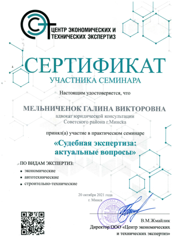 ООО “Центр экономических и технических экспертиз" 20 октября 2021г. был организован семинар на тему: "Судебная экспертиза: актуальные вопросы" по видам экспертиз: экономические, автотехнические, строительно-технические. Участие в семинаре принимала также адвокат Мельниченок Г.В.